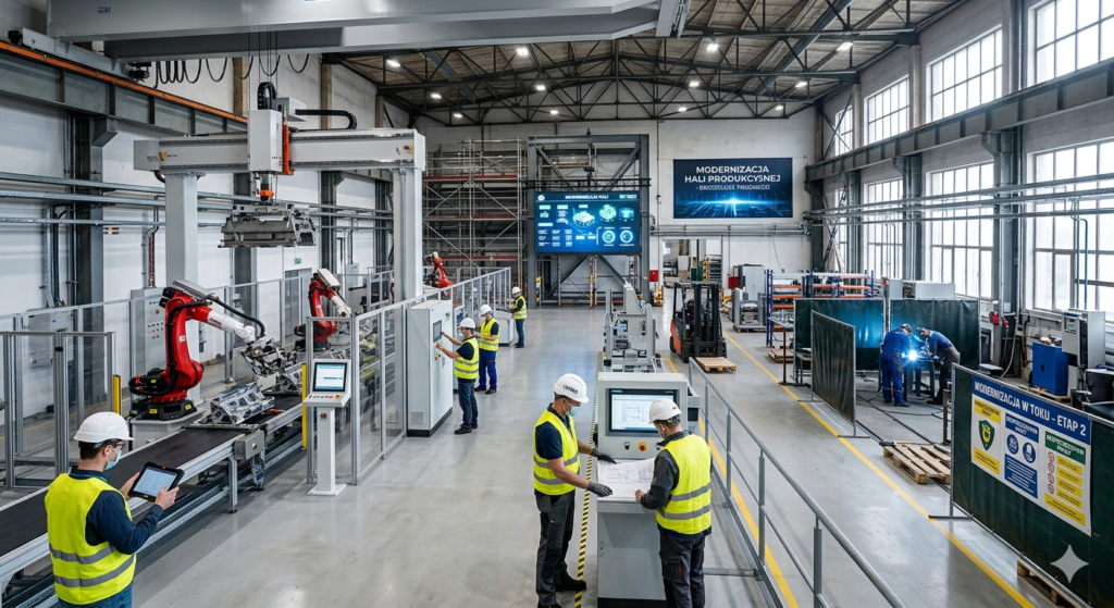 Oferujemy kompleksową modernizację hal produkcyjnych i obiektów przemysłowych. Realizujemy przebudowy, rozbudowy oraz dostosowanie hali do nowych linii technologicznych i wymagań produkcyjnych.